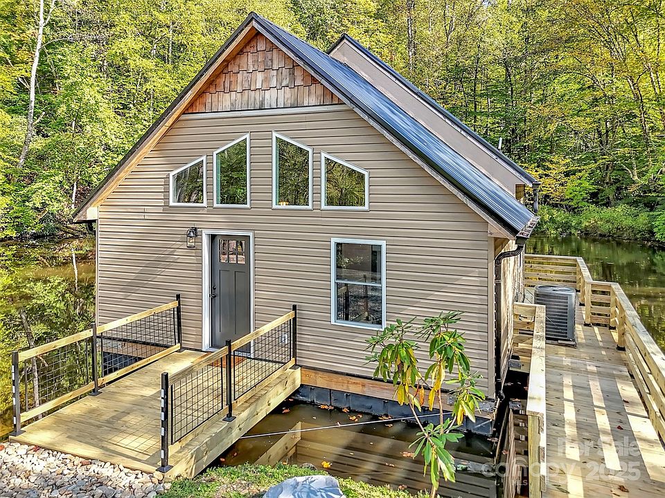 Escape to your private oasis in Maggie Valley! This unique floating cabin sits on a sprawling 2.5 acres with a pond, offering unparalleled tranquility and recreation. Enjoy the company of resident ducks and the peace of mind provided by a gated entrance. Spend your days paddleboarding, kayaking, or fishing right from your doorstep. Enjoy ultimate privacy while still being conveniently located near Cataloochee Ranch, Blue Ridge Parkway, Great Smoky Mountains National Park, downtown Waynesville, and local stores. This charming new construction retreat boasts one-level living with an inviting loft and a spacious wrap-around deck, perfect for soaking in the serene views.