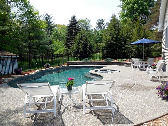 An elegant entry leads to a lovely, custom Colonial near desirable Thompson Pond and The Kettle Brook Golf Course! Sun-filled kitchen w/granite counters, glass subway tile, center island & stainless appliances w/ a new Grohe faucet and Fisher & Paykel counter depth refrig. Upgrades include Anderson windows, oak HW floors throughout the 1st floor & master bedroom, irrigation system, ceiling fans, central vac, custom window treatments & 2nd floor laundry room w/wash & dryer. Buderus propane heating in 2013, new HW heater 2014 & a generator hook-up. Spacious dining room w/triple windows overlooks the exquisite grounds. Serene living room w/recessed lighting & Mendota gas fireplace opens to a vaulted ceiling family room addition built in 2002 with a gorgeous wood ceiling and palladium window. 2010 master bath reno with DOUBLE walk-in closets. Composite entertaining deck leads to your own PRIVATE OASIS w/36x18 Pebbletec heated pool & spa hot tub, prof stone walls & established gardens!