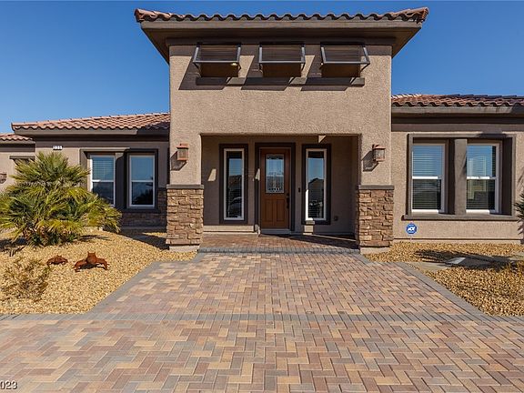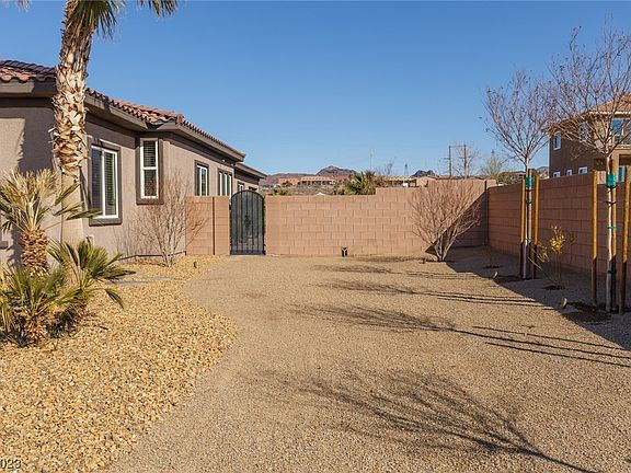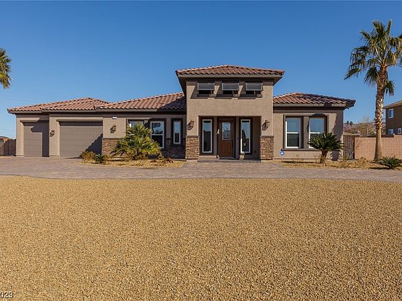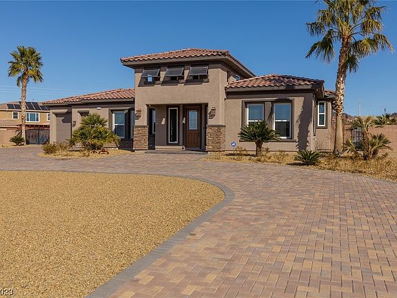 This custom single-story home was designed with luxury and leisure in mind. You'll have plenty of space to park all of your toys in the finished 5 car garage, and the RV parking with hook-ups will make traveling a breeze. The strip and mountain views from the property are breathtaking, and you'll be able to enjoy them from the comfort of your own home. The backyard is your own private park, complete with putting greens and a custom remote-control RC race track. The spacious primary suite has French doors that access the large covered patio, and the primary bathroom has a spa-like feel with a large walk-in glass shower. The gourmet kitchen is perfect for entertaining, with granite countertops, a walk-in pantry, and plenty of space to move around. The second primary guest suite is also spacious and has a private bathroom. The guest rooms are perfect for hosting out-of-town guests. Sit back and relax in this luxurious home and enjoy the most beautiful views and sunsets!