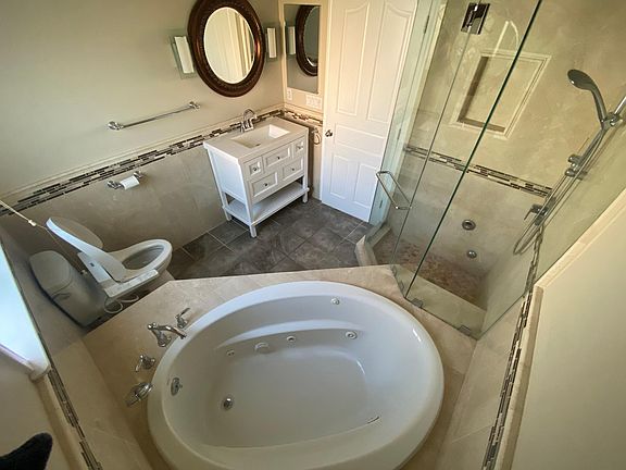 The entry opens into a bright living room with oversized windows and warm hardwood floors. The updated kitchen features abundant cabinet space, sleek stainless-steel appliances, and modern finishes. The spacious primary suite includes a beautifully upgraded bathroom with a sauna shower and a large jetted soaking tub your own private retreat.