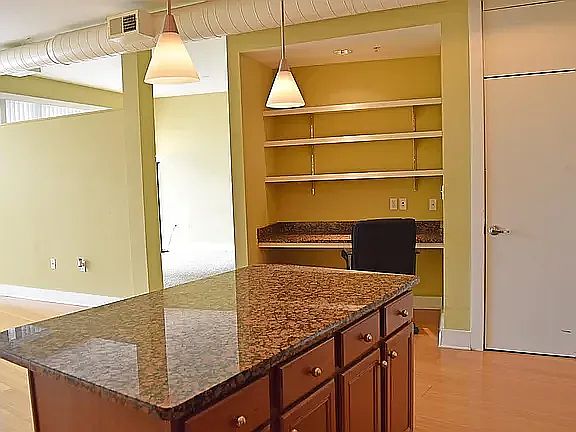 The kitchen comes fully equipped with a dishwasher, disposal, microwave, oven, and refrigerator, plus plenty of cabinet and workspace. A built-in study nook with shelving and a granite countertop provides the perfect spot for work or study.