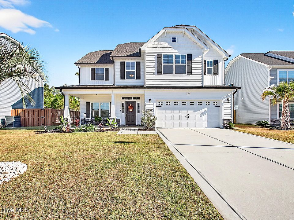 Welcome to 535 Transom Way in the desirable Oyster Landing community of Sneads Ferry. This 4 bedroom, 2.5 bath home offers 2,407 sq ft of well-designed living space and backs up to wooded privacy. The first floor features an open concept layout, dark wood flooring throughout, a gas log fireplace, and a spacious kitchen with white cabinetry, granite countertops, stainless steel appliances, and a large island. The formal dining room can also serve as a flex space for an office, playroom, or home gym.