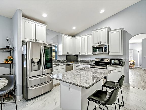Beautifully remodeled home, where the work is truly done! The 2022 kitchen remodel features granite countertops, white cabinets, SS appliances, & spacious center island. The open-concept living area has volume ceilings and luxurious herringbone vinyl plank flooring. The primary suite is a true retreat with an extended living area & updated 2022 bath with quartz dual vanities & walk-in shower. Recent upgrades include a 2022 HVAC, & epoxy-coated garage. Relax on your screened-in lanai. Desirable Citrus Springs community has clubhouse, heated pool, tennis & pickleball courts!