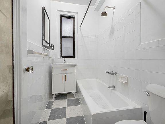 Unit 4A is a quiet, cozy refuge with 1 train on the corner, high ceilings and a combo washer dryer in unit. The renovated bathroom now crowns this spacious unit with a pretty entry foyer, massive windowed kitchen, and beamed ceilings in living room.
