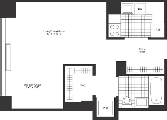 Beautiful Alcove Studio, 1 Bath with a walk-in closet, an in-home washer/dryer, upgraded strip wood floors, solar shades and northern exposure with views of the courtyard.