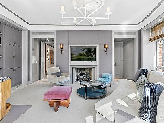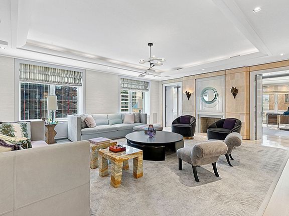 From your private elevator vestibule, enter a stately 30-foot gallery that introduces a home of grand scale and exceptional design. The 55-foot great room is bathed in natural light through five oversized north-facing windows and anchored by elegant proportions ideal for both formal entertaining and relaxed daily living. A corner library with gas fireplace and custom leather-wrapped millwork offers a quiet retreat of warmth and sophistication.