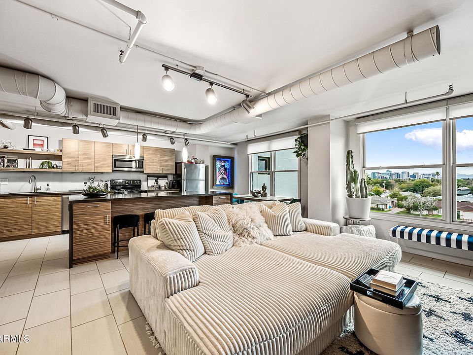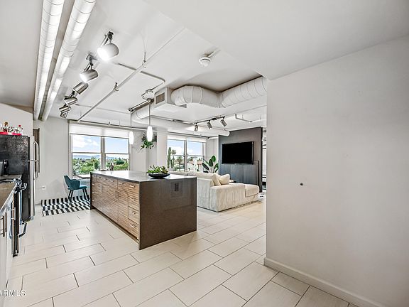 Experience elevated urban living in this stunning 4th-floor contemporary loft in the heart of Midtown Phoenix. Soaring ceilings and dramatic floor-to-ceiling windows flood the space with natural light while showcasing sweeping skyline views from Downtown to South Mountain. The open-concept layout features a gourmet kitchen with oversized waterfall island, quartz finishes, ample storage, exposed ductwork, and large-format tile flooring—perfect for entertaining or everyday living. The spacious primary suite offers custom closet organizers and striking views. Enjoy in-unit laundry and resort-style amenities including a heated pool, expansive fitness center with yoga/dance studio, indoor kitchen and bar, private office spaces, bike storage, dog park, and gated covered parking. Ideally located near light rail and across from St. Joseph's Hospital, with quick access to dining, shopping, and nightlife.