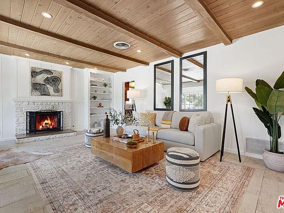 Located just steps from the vibrant shops and restaurants of Ventura Boulevard, this charming single-story ranch blends modern updates with classic character. The spacious living room welcomes you with a cozy wood-burning fireplace and seamlessly flows into a warm, country-style kitchen featuring stainless steel appliances, a walk-in pantry, and an inviting dining area. The private primary suite offers a renovated bathroom and generous closet space, while three additional bedrooms - one with a skylight - share a stylishly updated full bath. Designed for entertaining, the backyard is a true retreat, surrounded by mature privacy hedges and highlighted by a stone patio and a stunning lap pool and spa with a cascading waterfall feature. Additional features include exposed wood-beamed ceilings that add architectural charm, ceiling fans in all bedrooms for year-round comfort, a convenient laundry closet, and a two-car garage equipped with an electric vehicle charging adapter. This move-in-ready gem perfectly combines comfort, style, and convenience in one of Woodland Hills' most desirable neighborhoods.
