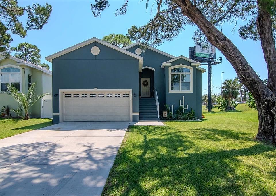 Welcome to 5352 Cotee River Drive! Built in 2021, this elevated block stucco home offers 3 bedrooms, 2 baths, and a spacious floor plan with tasteful, modern updates throughout. Enjoy durable vinyl plank flooring, an open-concept layout, and a stylish kitchen featuring updated cabinets, countertops, bar seating, and stainless steel appliances (all 2021). The oversized garage provides space for a golf cart, boat gear, or workshop. The spacious primary suite includes a beautiful ensuite bathroom with a double vanity, and walk-in shower, and large walk-in closet. Relax in the screened-in back lanai or cool off in the above-ground stock tank pool with a custom deck. With NO HOA, you can store your boat or RV right on your property and launch just down the road at the Main Street boat ramp. Both additional bedrooms are spacious and located conveniently to the additional bathroom which is equipped with a shower and bathtub. This home is move-in ready with a 2021 roof, A/C, water heater, and appliances. Live the Florida lifestyle - this home is just a quick golf cart ride to Downtown New Port Richey, where you’ll find top-rated restaurants, local breweries, parks, boutique shops, and year-round events like the Chasco Fiesta, Cotee River Seafest, and concerts at Sims Park. Don't miss your opportunity to own this beautiful property, located in the perfect location!