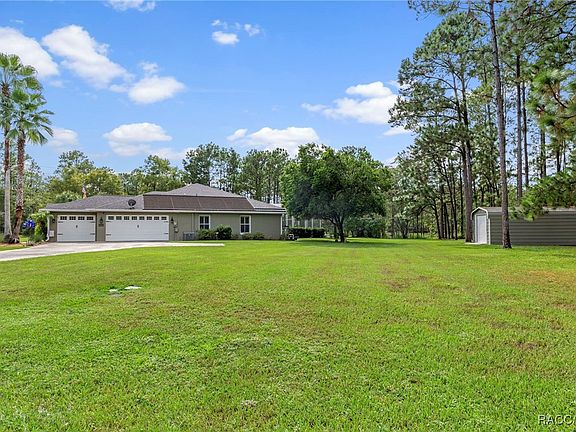 Incredible Value in Pine Ridge Estates! This stately pool home sits proudly on a corner lot with stunning curb appeal and unmatched privacy, via the adjacent 2.5+ acres of county-owned land. Step inside to find a beautifully updated interior featuring luxury vinyl plank flooring, stylish light fixtures, plantation shutters, and fresh paint inside and out. The kitchen is a dream with new appliances, pull-out cabinets, and a reverse osmosis water system. The floor plan offers 3 bedrooms and 2 full bathrooms giving you the perfect balance of comfort and function. The owner’s suite boasts a tray ceiling, dual walk-in closets, and direct access to the heated saltwater pool. The second bath also connects to the pool patio for easy entertaining.Every detail has been thoughtfully upgraded: a brand-new roof, newly screened lanai, professional landscaping, and a 10-zone irrigation system with smart controller. Additional perks include gutters with environmental water barrels, hurricane shutters, and a storage shed. Living in the prestigious Pine Ridge Estates means enjoying a one-of-a-kind nature paradise with endless amenities—tennis, pickleball, shuffleboard, playground, dog parks, 28 miles of walking and horseback riding trails, a co-op horse barn, riding arenas, and even an RC flying field.This gem is move-in ready and offers the lifestyle you’ve been searching for. Don’t be late to the party!