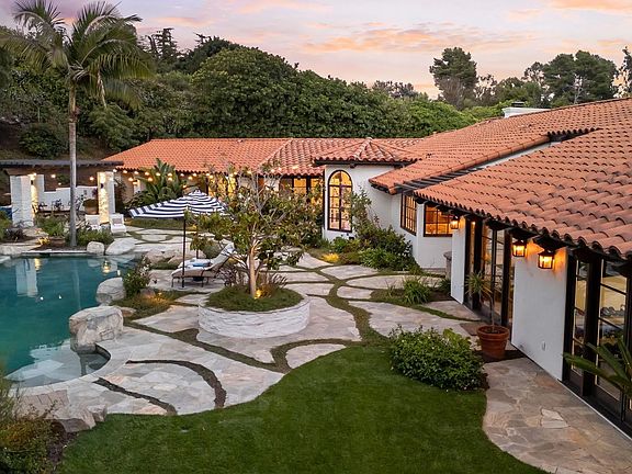 INCREDIBLE single-level estate located in the prestigious Rancho Santa Fe Covenant. Privately gated on 3.39 acres of picturesque land with serene views and unmatched privacy. This light-filled home features Saltillo tile throughout, 4+ bedrooms including a spacious live-in guest suite, and an expansive primary retreat with a reimagined spa-inspired bath complete with soaking tub, custom oversized walk-in steam shower, and private courtyard with hot tub. Additional highlights include a full gym, executive library, dedicated office, and a custom bar perfect for entertaining. The layout flows seamlessly to a resort-style saltwater pool with hot tub, splash pool, cascading waterfall, and a spacious covered patio with built-in BBQ and wood-burning fireplace, the ultimate setting for indoor-outdoor living. Smart home upgrades include built-in speakers, Pentair system, Doorbird, security cameras, EV charger, and fully owned solar with 3 backup batteries for easy living. A generous motor court, 200+ avocado tree grove, and family citrus orchard make this home truly special!