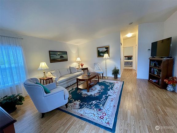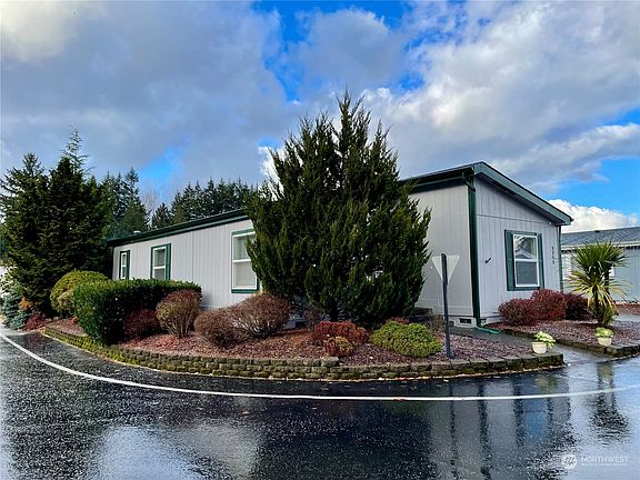 Nice 2-bedroom home in Eagle's Landing! Features open concept, vaulted ceiling & lots of windows for natural light. Kitchen shows great with custom maple cabinets, tile backsplash, eating bar & all appliances included! Laminate wood floor, new blinds, and separate den/office. Oversized primary bedroom with large walk-in closet, and walk-in shower in primary bath for easy access. Extra storage & central A/C. Detached 2-car garage, stone-patio in back, feels private. Corner lot with landscaped yard, raised garden bed. Close to shopping, I-5 & medical facilities. A must see!