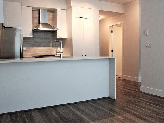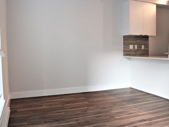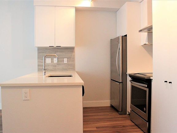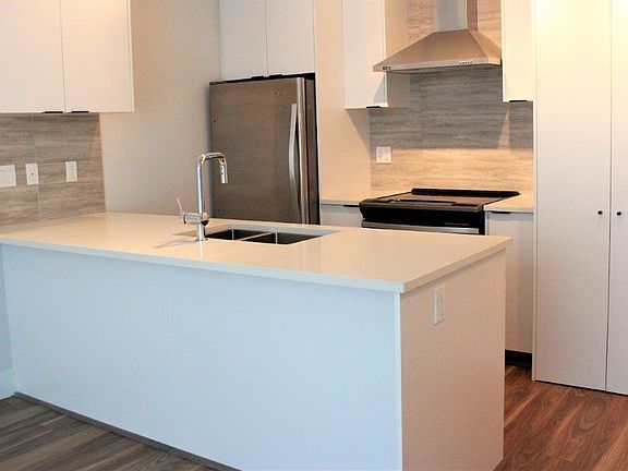 This Burnaby Metro Town unfurnished condo rental is the perfect place to call home. With 438 square feet including 1 bedroom plus 1 bathroom, this condo is ready for you to customize as your own. Start in the kitchen of this Burnaby Metro Town unfurnished condo rental where upscale stainless steel appliances and modern white cabinetry make the space feel fresh. The kitchen features beautiful quartz countertops and neutral back splash tiling perfect to pair with the modern laminate flooring. Find plenty of storage space for all your kitchen amenities, cookware and tableware and enjoy your meals at the large eat in breakfast bar that only needs a few seats. The space opens to reveal the main living areas illuminated with beautiful lighting from the windows and offers balcony access.