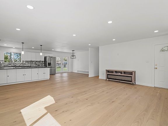 The living room, kitchen, dining room, and hall feature Eastern European white oak hardwood flooring, adding a touch of elegance to the open floor plan. The new plush carpet in the bedrooms provides comfort and warmth. The large kitchen island enhances the entertaining space, making hosting gatherings a joy.