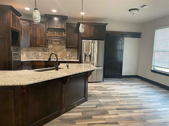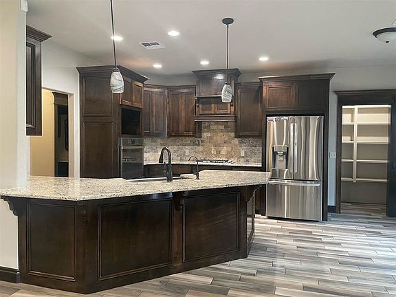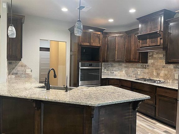 This 4 bedroom, 3 bath home with a separate 3rd car garage will leave you wanting for nothing more. The floor plan is open with high ceilings and wood style ceramic tile plank flooring throughout. There is a double oven, gas stove top, granite counter tops, dishwasher, refrigerator, purified waterspout, breakfast bar and large dining area plus two pantries in the kitchen that overlooks the spacious living room. The primary bedroom has a separate entry to your back patio, two vanity sinks, beautifully tiled shower, whirlpool tub, enclosed toilet and best of all a walk-in closet with built in shelves and dressers that leads straight into the laundry room. Two of the bedrooms located on the opposite side of the home share a Jack and Jill bathroom. One of the rooms has an oversized walk-in closet and the other is a smaller version of a walk-in closet. The third bedroom is in the center of the home and can act as an office or a true bedroom with a solid door and closet. Need cabinet storage? The home has that too. There are energy saving solar panels on the roof that are fully paid for and now yours to save on the electric bill each month without any of the initial cost to recoup. There is a Genrac generator system to give you piece of mind during our Oklahoma storms. You will stay comfortable, lighted and no food spoilage. There is a water softener system as well, say goodbye to bad hair days and hard water. The roof is 6 months old, and the backyard has a fabulous patio area and plenty of grass area to fulfill any activity you desire while enjoying the outside. The seller has left a book for the new owner to have all the data about the home in one convenient binder that you can continue to add to over the years. Schedule an appointment today for a private showing, Cosmo Realty 580-284-6088.
