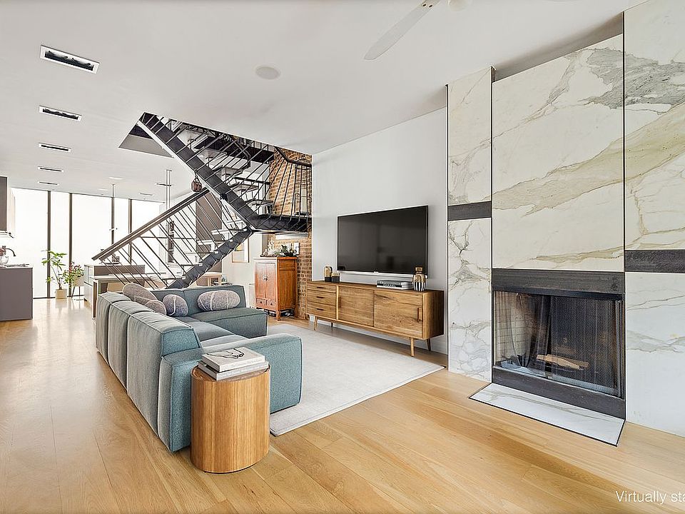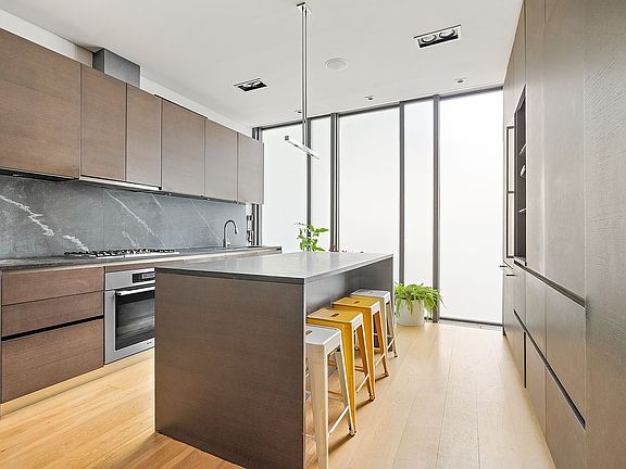 A true design lover's dream, this striking Carroll Gardens duplex seamlessly blends warm modernism with industrial accents, housed behind a sculptural facade of floor-to-ceiling translucent glass and oxidized metal.