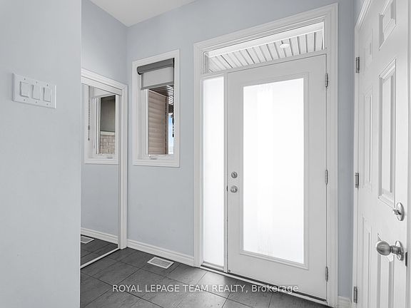Bright and airy foyerDouble closetLight grey tonesAbundant natural lightWalnut-toned engineered hardwood floorsQuartz countertopsTile backsplash