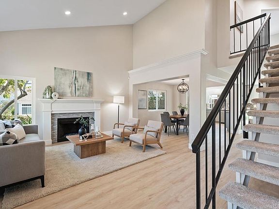 Nestled on a spacious corner lot within a peaceful double cul-de-sac, this completely remodeled home offers a perfect blend of modern upgrades, a main-level bedroom and full bath, and inviting spaces. Upon entry, you’ll be greeted by an open-concept layout that seamlessly connects the living, dining, and kitchen areas. Natural light floods the home, accentuating the soaring ceilings and creating a bright, airy feel throughout. The chef’s kitchen is the heart of the home, featuring custom-painted cabinets with new pulls. Abundant storage,sleek granite countertops, top-tier stainless steel appliances, a custom overhead stainless steel exhaust, and a large countertop area with both prep space and casual breakfast bar seating. The kitchen flows effortlessly into the expansive dining area and living space, making it an ideal setting for both everyday living and entertaining. The home has been tastefully remodeled inside and out, including brand-new luxury vinyl plank flooring, new carpet, fresh paint, 5-inch baseboards, updated door hinges and handles, a custom-painted staircase, new light fixtures, and newly installed outlets and outlet covers. The finished garage features upgraded epoxy flooring, overhead storage, and cabinets. The home is equipped with a leased whole-house water softener system and central air conditioning for year-round comfort. The living and dining areas open to the private backyard, where a pergola-covered patio offers the perfect spot for hosting guests or relaxing under the California sun. The exterior boasts new custom tropical landscaping, a fully fenced yard, a large patio, and a pergola, creating an ideal environment for relaxation and entertaining. A storage shed and a hot tub pad with 220-volt electric complete the outdoor space, ready for your personal retreat. This home features four generously sized bedrooms, including one conveniently located on the main floor with access to a full bath—ideal for guests or multi-generational living. Upstairs, the spacious primary suite serves as a peaceful retreat, complete with a large closet and serene surroundings. Two additional well-sized bedrooms offer versatility for family, an office, or hobbies. No HOA or monthly fee fees. With thoughtful full remodel, high ceilings, a full bed and bath on the main level, and an attached two-car garage, this move-in-ready home combines modern luxury and practicality in one of North County’s most desirable neighborhoods.