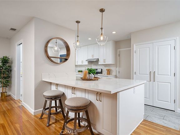 Welcome to this beautifully remodeled and updated single-story home located on a charming tree-lined street in desirable North Glendora. Offering 3 bedrooms, 2 bathrooms, and 1,716 sq. ft. of living space on a 7,461 sq. ft. flat lot, this home is just a short walk to the vibrant Glendora Village with its quaint shops and restaurants and lies within the highly acclaimed Glendora Unified School District. A welcoming brick front porch and brand-new front door set the tone for the stylish interior. Inside, an open living room with a custom gas fireplace with mantle flows seamlessly into the formal dining area. The stunning, fully remodeled open kitchen features new white cabinetry, quartz countertops, a center island with pendant lighting, stainless steel appliances (gas range, dishwasher, microwave drawer, and refrigerator), a large pantry, and convenient direct access to the attached garage. A separate family room offers additional living space, highlighted by a custom built-in entertainment center and a sliding door that opens to the covered outdoor patio. The private primary suite includes a spacious walk-in closet, slider to the backyard, and a beautifully updated bathroom with an oversized shower and dual-sink vanity. Two additional bedrooms with spacious closets and a full hallway bathroom complete the interior.