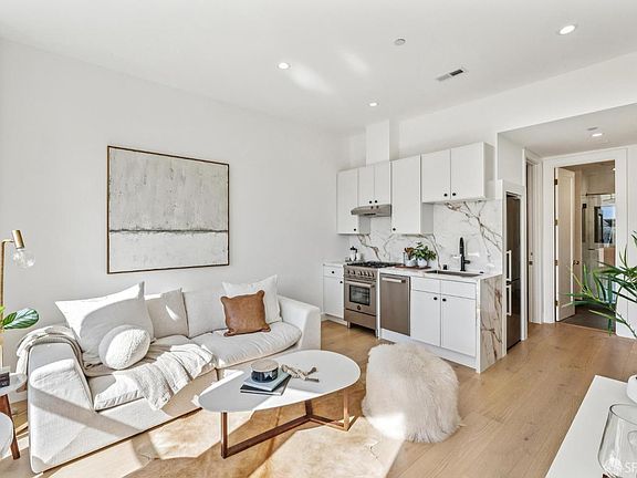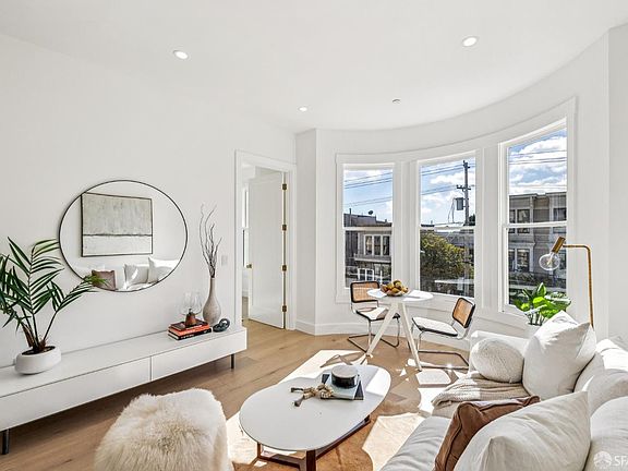 Down-to-the-studs designer renovation showcasing refined materials, clean modern lines, and beautiful natural light. The open-plan living/dining area with bay windows frames leafy Page Street, a designated Slow Street and bike path inviting daily walks and weekend rides. The chef's kitchen features custom cabinetry with under-cabinet lighting, Porcelanosa counters with full backsplash, and high-end stainless appliances including a Bertazzoni range and French-door refrigerator with ice maker. The serene primary suite enjoys bay windows, dual closets, and a luxe Porcelanosa bath with glass-enclosed walk-in shower, floating vanity, and tankless toilet. A second bedroom offers flexibility for guests or a stylish home office. Additional highlights include wide-plank white oak floors, recessed lighting, 8' custom doors, washer/dryer hookups, and forced-air heat. Shared garden with mature landscaping and King Palm. Premier Hayes Valley location with effortless access to Hayes Street, Valencia Corridor, and Lower Haight cafes, boutiques, nightlife, and transit.