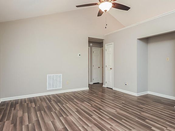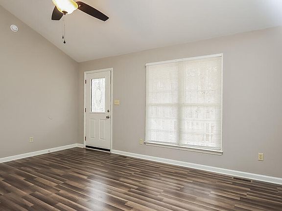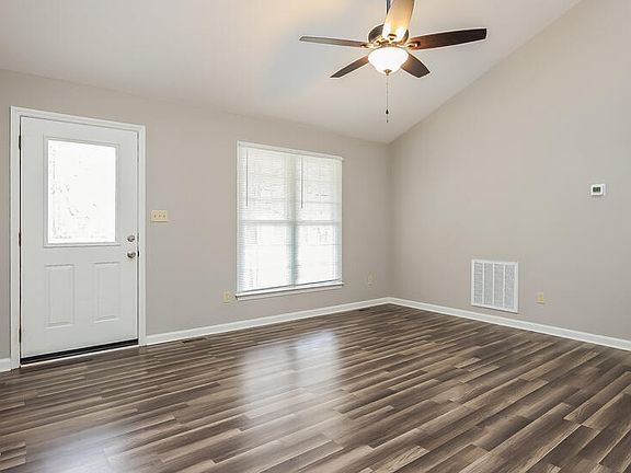 Vaulted family roomSplit bedroom layoutLaminate flooringBright white kitchenCeiling fan