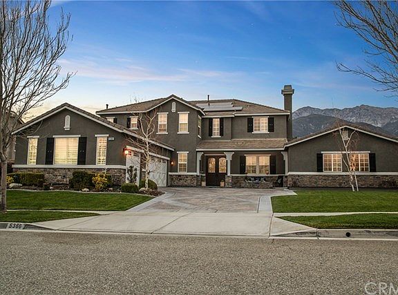 What a spectacular property with a guest house in Rancho Cucamonga! The 1,000 SF attached guest house is perfect for extended family living or as an awesome pool house with gorgeous custom doors that open to the pool! It is complete with a living room, fireplace, kitchenette, wine chiller, dining area, bedroom, ample closet space & bathroom with a shower. Exceptional main house offers 5 bedrooms (one on the main level) & 2 full bathrooms. Enjoy an elegant floor plan perfect for entertaining! Impressive entryway opens to the formal living room on one side with a fireplace & custom wall finished with stone veneer. To the other side, you have more gorgeous stone wall treatment in the separate formal dining room, ideal for fun dinner parties. Stunning kitchen features a butler's pantry, granite counter tops, island breakfast bar with pendant lighting, dark wood cabinetry, glass tile back splash, large walk-in pantry, double ovens & French doors leading to the backyard. Extra wide grand staircase leads to 4 bedrooms, including the impressive master suite. Amazing backyard is newly remodeled & ready for your next pool party! Enjoy the custom pool with spa, grotto, swim-up BBQ, sitting area, built-in BBQ, pizza oven & more! A tiered California Room style veranda gives you a stylish lounge space with partial city lights view, recessed lighting, TV, gas fireplace, mini fridge & more 3 car garage with epoxy flooring. Solar panels are leased and can help you rely on a lower energy bill