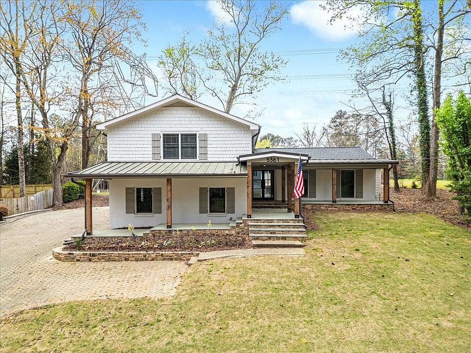 Meticulously renovated home in the heart of Dunwoody in sought after Kingsley. So many upgrades! New kitchen, baths, flooring, windows, plus all new paint, siding, porch, and roof! The beautiful paver stone driveway with additional parking pad leads to an impressive covered front porch and brand-new front double doors. The main level features an open living and dining area with gorgeous hardwood flooring, a bright new kitchen with quartz countertops and stainless-steel appliances, and a vaulted sunroom addition with its own mini-split AC. The kitchen also opens to the cozy fireside family room. The garage has been converted into a large bedroom/entertainment room or home office with stylish shiplap walls and a full bathroom. Upstairs you’ll find 4 bedrooms and 2 baths with hardwoods throughout, high baseboards & new modern ceiling fans. The master bath features all new double vanity, and a frameless glass, tiled shower. Outside, you'll find a large versatile workshop with electricity, plus a walkout to a paver patio and a huge level backyard. It is perfect for cookouts, entertaining guests or planting a vegetable garden. Move-in ready. Close to Kroger, CVS, & walking distance to All Saints Catholic Church & Marcus Jewish Community Center. Low rate, assumable loan. Optional membership at Kingsley Racquet & Swim Club.