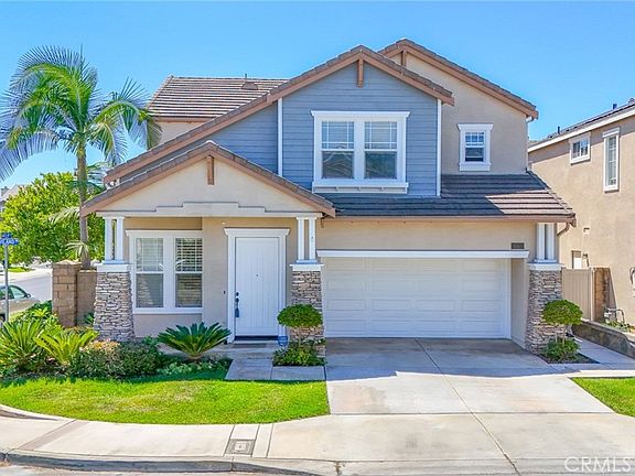 Great corner lot Avalon Plan 1 with 3 bedrooms and 2.5 baths. The house features a spacious island kitchen with granite countertops, a built-in entertainment center with a dining area, wood shutters, and a built-in desk in the office/tech center. The house also has upgraded paint throughout, extra storage in the garage and the 3rd bedroom, a formal living room off the entry, a walk-in pantry, and a slate stone backyard with a natural gas barbecue. A Jack and Jill bathroom is upstairs and a huge master bath with a separate tub and shower. Exclusive ocean-close neighborhood of Summer Lane with a large private park and community pool. Almost 2000 square feet of living space with. Master suite with large walk-in closet, dual sinks, soaking tub, and separate shower! Spacious secondary bedrooms with jack and jill bathroom with dual sinks. Convenient interior upstairs laundry room with sink! Attached 2 car garage with direct access to the home, built-in cabinets. Backyard with professional hardscape and landscaping, automatic sprinklers – very easy maintenance and built-in BBQ center. Walk to the community pool and park and just a short bike ride to the beach and drive to most freeways and walking distance to dining, shopping and entertainment.