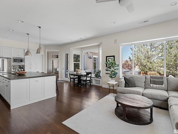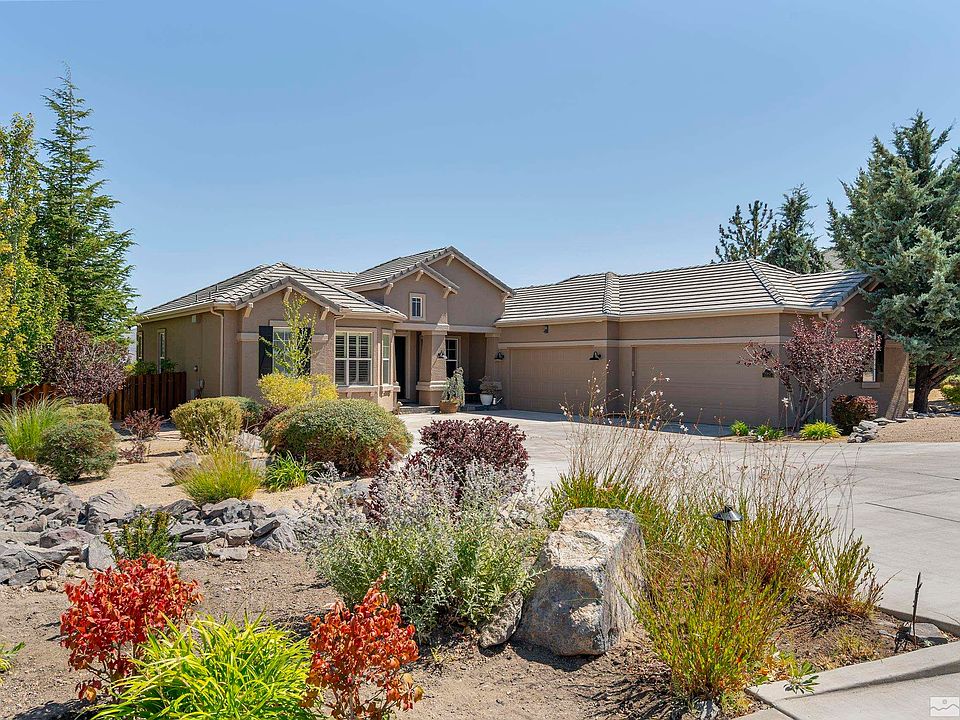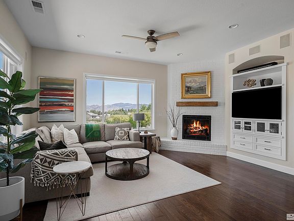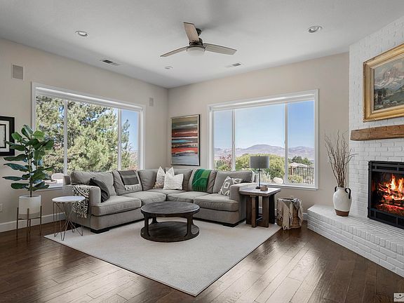 Welcome to SouthWest Vistas! **SINGLE STORY WITH CITY & MOUNTAIN VIEWS! NO BACKYARD NEIGHBORS** New Exterior & Interior Paint '24 & New gutters '23. OVER $250,000 IN UPGRADES:KITCHEN, ALL BATHROOMS, CARPET & LIGHTING. Jacuzzi, sauna & rec room/gym. Two refrigerators & washer/dryer included. Exceptionally well cared for, highly upgraded, contemporary home with stunning views from the spacious patio. Peaceful backyard features a well orientated gas firepit & manicured landscaping. Convenient walking trails., 4 car garage has been converted to two car garage with accommodating conversion available back to four car. Converted garage space is used as rec room/gym and not counted in square footage. Garage EV charger. Nest system. Quiet neighborhood and only 20 min from Mt. Rose Ski Resort & 40 min from Lake Tahoe!