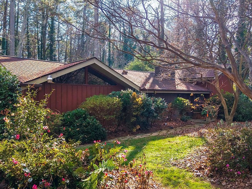Cedar sided Mid Century Modern - one of a kind. Custom designed and built. Classic period features such as the bottle glass textured side light panel next to the front doors. A glimpse to the left and you will see the cylindrical redwood stairway to the upper floor. As you enter the great room, you will see a vaulted redwood ceiling, the last of the redwoods harvested for home building. The wall separating the foyer from the great room is floor to ceiling brick with a fireplace. There are original hardwoods throughout the upper and main levels. The great room has a view to the back yard through large sliders. The dining room is open to the great room, sharing the same vaulted ceiling with trapezoid openings at the top giving a feeling of a chalet. The dining room also has sliders bringing in a lot of natural light. Continue to the kitchen and you will see the door to the oversized garage at your right. The kitchen has tall cabinetry and an efficient design. The giant ball lights overhead are definitely period fixtures. Gas cooktop, Miele Dishwasher, oven with broiler are installed appliance. There is an updated counter and floor in the kitchen. A nook for laundry separates the kitchen from the foyer. The upper level has three bedrooms and two baths. Generous windows have a view of the woods at the side of the house. The primary bedroom has a window unit ac only because the owners like cooler temps in the bedroom. The lower level has a den with a walk out to a patio, another bedroom, a bath and an unfinished room that walks out to the side yard. The hallway has a horizontal wine rack to store your favorite vino. There is a tankless water heater servicing the home. The 1.19 acre lot is likely to surprise you in spring with flowers blooming from the owners gardens which were at one time a showplace. The oversized garage with a side entry provides lots of options for storage and use. Home is sold as is. It is freshly painted with new carpet in the lower level.