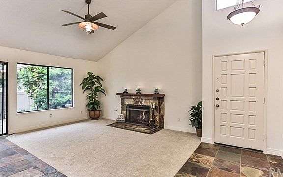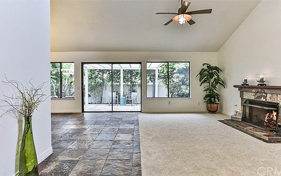 Welcome to the beautiful neighborhood of Meadowood in Yorba Linda. Enjoy living with Tree lined streets, beautiful flowering landscaping, park like grounds, large pool, and spa. The single story home offers an open floor plan with three bedrooms, and two full bathrooms. The large master bedroom and bath features vaulted ceilings, walk in closet with organizer, and a charming private patio. The over-sized master bath has double sinks, large skylight, and walk in shower, with a bench. The entire home is freshly painted, and is graced with gorgeous natural stone floors and gas fireplace. All three bedrooms have new carpet, and ceiling fans with remote controls. The kitchen has an extra high ceiling with an abundance of recessed lighting, high end stainless steel appliances including refrigerator, large sink, granite tile counters and back-splash, with a large pass thru to the dining room.The entire great room has a view of the beautiful stone patio adorned with lush plants, trees, flowers, and rock garden, the perfect setting for morning coffee, and evening alfresco dinning. Private patio is equipped with landscaping lighting, and sprinklers on a timer. All the exterior landscaping on the property is meticulously maintained by the association. The two car garage has plenty of storage with large built in cabinets, a workbench, and door that leads into a laundry room complete with washer, dryer, and additional storage.
