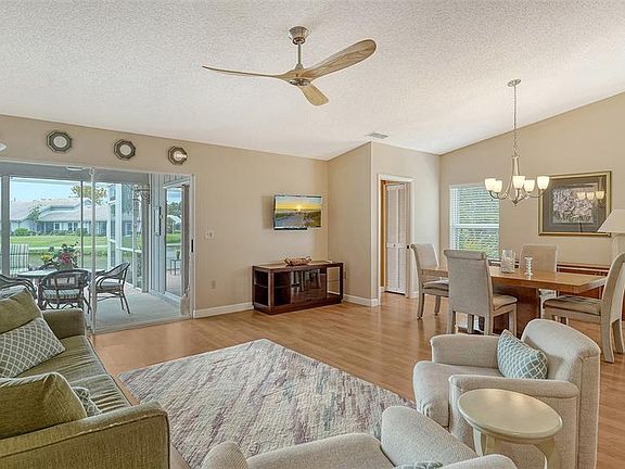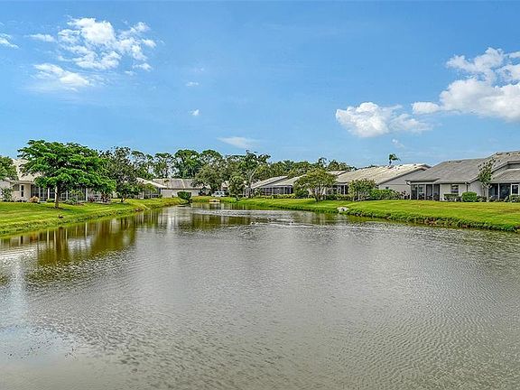 CRESTWOOD VILLAS!! GREAT LOCATION!! Lovely Re-modeled 3BR/2BA turn-key furnished, two car garage end unit with beautiful lake view in a maintenance free community. This home features an open floor plan, Pergo wood plank flooring, with lots of great natural lighting from the end unit windows facing west and the sliding glass doors out to the porch plus a large lanai offering you great sunrise and nature views looking out to a large lake. All the units in Crestwood Villas are getting new roofs as the contract is signed and paid in full. You will find impressive granite counter tops in the kitchen and in the guest bath. The generously sized kitchen features, natural wood color cabinets, a stainless-steel appliance package, pantry closet, and eat-in area. There are three sliding glass doors allowing direct and convenient step out to your covered, screened in porch from the Great Room and the Kitchen. This four-season area includes a new dining table plus four chairs, a buffet on wheels, plus two cushioned chaises all on this private lanai with your tropical Areka palms. The vaulted ceiling in the Great Room allows for optimal space and features a couch, two comfortable swivel chairs, a wall buffet table with bar along with a low entertainment center all opening to the Dining Room that features a cedar wood 4-8 person dining room table (with two leaf’s) including 4 chairs and a matching oversized buffet with storage for China. Six Ceiling Fans are featured throughout the home and the villa has a security system in place. The Primary oversized bedroom suite includes a king-sized bed, sitting area with leather couch and a large walk-in closet. The primary bathroom has double vanities, spacious linen storage closet, and a separate private shower area. The guest bedroom features twin beds and a desk with a bookcase. The third bedroom is a flex room with a large electric lounger sofa, built-in professional desk, tv, computer space and large storage closet. The laundry room has a Speed Queen Washer and Dryer with twin cabinets above for lots of storage. The newly painted two car garage offers you lots of storage with a wall of cabinets plus a separate cabinetry and peg board. This lovely community has many amenities such as the Geo Heated Thermal pool, clubhouse and tennis and pickle ball courts. Crestwood Villas is located near a beautiful park, lots of shopping and restaurants are close by and you are just minutes to the award-winning Siesta Key Beach!! Schedule your private showing today!
