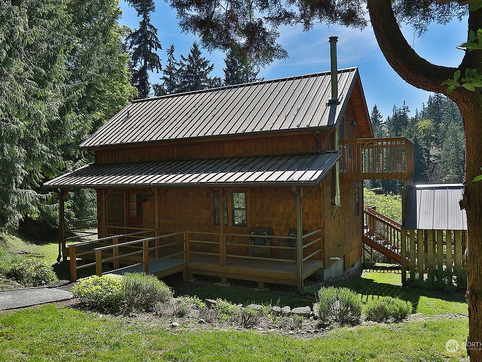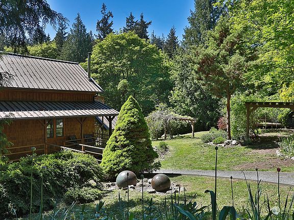 Craftsman on 6± acres is a dream retreat! Recent updates, such as metal roofs on all structures, deck railings, whole house Generac generator, new windows, gutters, bathroom, appliances, solar panels, furnace & ductwork. The 1000 sqft studio; upstairs area finished with LVP & efficient wall panel heat, a comfortable space for various activities & downstairs area, is drywall finish, concrete floors, heated & can serve as storage, workshop or additional studio space. There is a 24x24' covered parking area, perfect for protecting vehicles or outdoor equipment. Picturesque, with circular drive, entertainment-sized deck, arbors, mature plants, and a pond enhancing its natural beauty. Perfect blend of charm, functionality, and natural beauty!