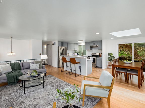 Nestled in the coveted hills of South Eugene, this beautifully updated home offers convenience and comfort with easy access to bus lines and shopping. The home features fresh interior and exterior paint, refinished oak floors, and new laminate/carpet flooring. The remodeled kitchen showcases shaker cabinets, quartz countertops, stainless steel appliances, and a work island and eating bar. Enjoy the warmth of a wood-burning fireplace. Note the skylights that fill the space with natural light as well as a front balcony beyond beautiful french doors. The upstairs primary suite offers double sinks, a large standalone shower, soaking tub, and tile flooring. The lower level includes a bedroom, bathroom, laundry room, and a spacious family room. New doors, windows, and trim throughout, plus a 10-year-old roof. This is a must-see!