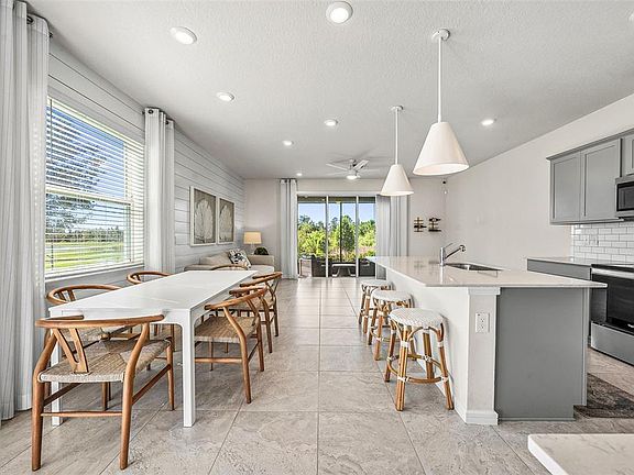 Welcome to this beautifully upgraded Ashe Floor Plan, former MODEL HOME! The biggest floor plan in the community with 3 bedrooms, 2.5 baths, upstairs loft, screened in back patio, a rare 2 car garage with epoxy flooring, oversized corner lot, and highly desired conservation wetland views. As a former model home, this property showcases designer upgrades throughout- including custom shiplap and accent walls, upgraded lighting, a glass insert front door, premium finishes, and a Smart Home technology package with a video doorbell. This home features stylish grey cabinets and quartz countertops in the kitchen and baths. Tile flooring in the main living areas and bathrooms, and stain-resistant carpet in the bedrooms and loft. The kitchen includes Whirlpool stainless steel appliances, a large single bowl sink, subway tile, and an island for bar seating. Off of the open kitchen is a breakfast area, half bath, and spacious living area overlooking the private backyard. Extra storage is located under the stairs. On the second floor you will find the spacious Owner's suite that has a large walk in closet and dual sinks in the Owner's bath. The second and third bedrooms, loft, guest bathroom, and laundry with Whirlpool washer and dryer are all located on the 2nd floor. The Chapel Crossing community has several amenities for you to enjoy including a Clubhouse, Pool with a lazy river, Gym, Dog Park, Pickle Ball Courts, and Playground. Perfectly situated off SR-54 and minutes from I-75, lots of shopping and dining close by!!