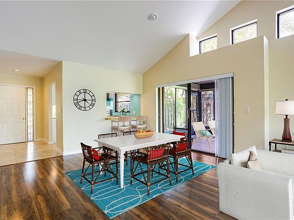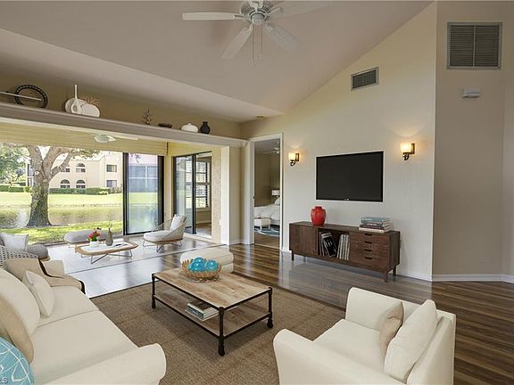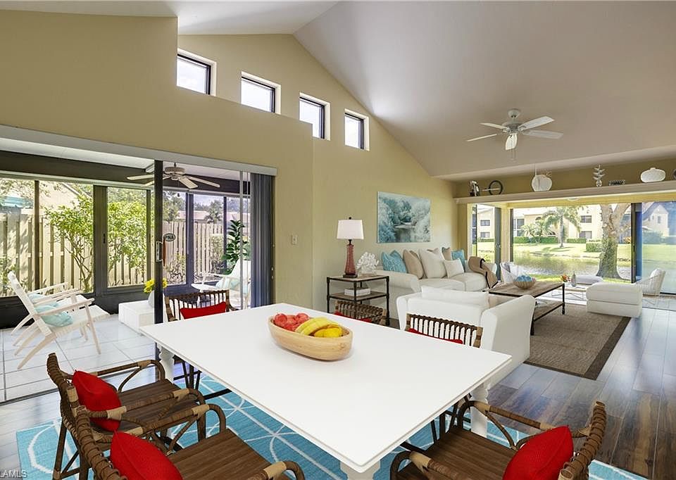 Peaceful water views & the sounds of a relaxing water fountain can be enjoyed from multiple rooms in this Beachwalk attached villa. Southern exposure and a grand, vaulted ceiling ensure you'll always have a light & bright living space. The large side porch is a "grandfathered" feature and can no longer be added to villas without one. This 10' x 14' room offers spacious outdoor living & large windows that easily slide open to screens. The rear lanai is glass enclosed & creates more living space than the average villa. The fully-updated kitchen offers excellent storage & work-space. Entire villa has been repainted from top to bottom & is move-in ready! A well-suited master suite, detached garage & updated plumbing add to this villa's desirability. Beachwalk is guard gated with a variety of resort style amenities including clubhouse, pool, spa, tennis & bocce. There is a secured pedestrian gate offering residents convenient access to Vanderbilt Beach. A perfect location West of 41 with quick access to dining, shopping, entertainment & more at Pavilion & Mercato. Incredible investment opportunity - Beachwalk has a rental policy allowing 30-day minimum leases up to 12 times per year.