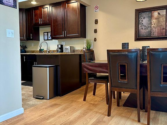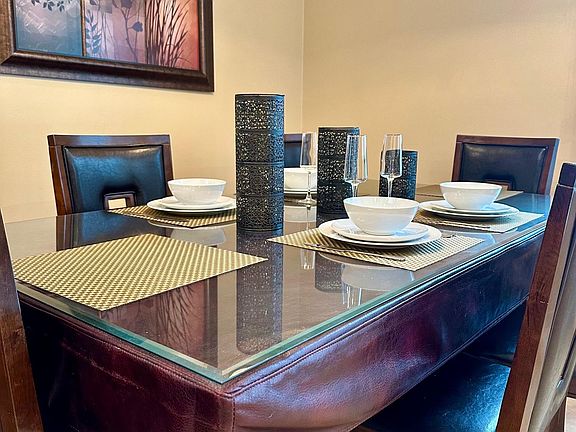 The gourmet kitchen features stainless appliances including a refrigerator, dishwasher, and stove with oven. There are also small appliances including a toaster, coffee maker, and blender. Everything you need to prepare a quick bite or elaborate feast is available. There is a separate dining area, adjacent to the kitchen that features space for 6 as well.