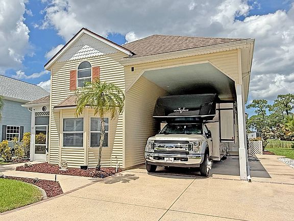 The perfect winter retreat or full-time residence, you have to check out this beautifully remodeled RV resort home with golf course and water view. This home features hurricane shutters; HVAC with built-in air purifier and an RV port that measures 14'x35'x13'2" with an added shed for storage or golf cart parking. If shed is removed, the port will gain 7; allowing for 42' RV parking with full hookups. This beautiful home comes fully furnished and ready to move in - just bring your toothbrush! Located in an exclusive gated community with a championship 18-hole golf course and many amenities including on site restaurants/bar, pickleball and tennis courts, 2 heated pools, 2 hot-tubs, fitness center, you can live in a care-free lifestyle where the low maintenance fees covers complete lawn and sprinkler system maintenance, 24-hour attended guardhouse with roaming Courtesy Patrol; water & sewer included; Spectrum internet cable DVR, daily trash pickup, miles of nature and walking trails, Doggie World, planned activities; Internet and cable tv, and an exchange library!! Centrally located on Florida's Space Coast and a short distance to Kennedy Space Center, Port Canaveral Cruise Terminals, Canaveral Sea Shore, Beaches, Orlando theme park attractions, Daytona Speedway and Orlando International Airport.