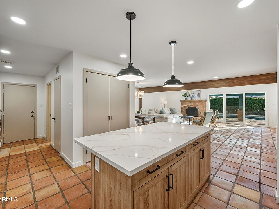 Once inside, you'll immediately notice the character - original Saltillo floors, exposed wood beams, and the original gas fireplace greet you. The open concept floor plan offers a huge great