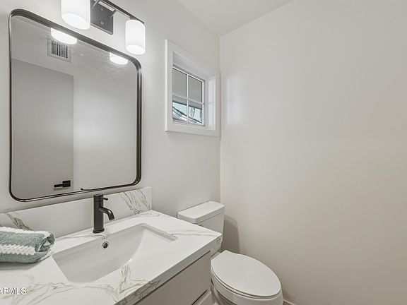 Both the hall bathroom and primary bedroom en suite bathroom offer double sinks, quartz countertops, new tile work and cabinets, and gorgeous stained-glass windows. There's also a fully-renovated half-bath off the kitchen for guests.