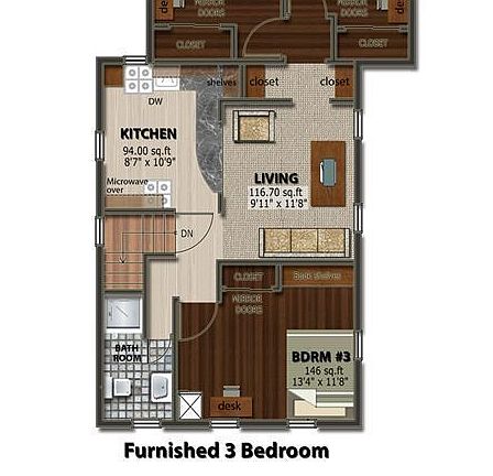 Furnished, each room with a Bed, Desk and Dresser, couch with Coffe table in the living room and kitchen stools