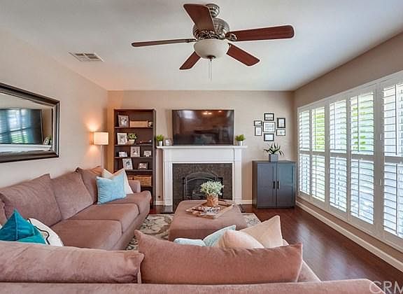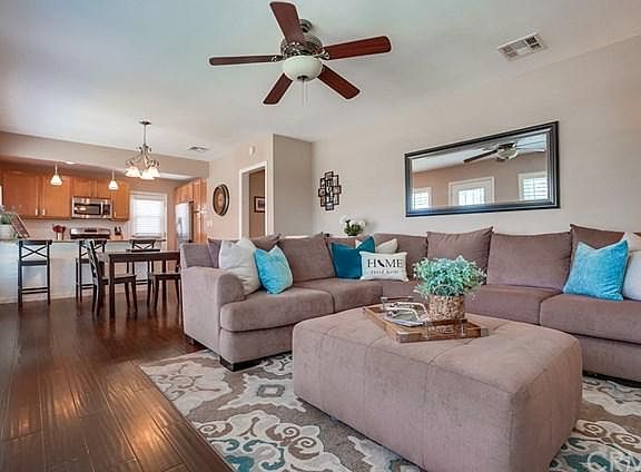 This wonderful north facing home is situated on one of the quietest streets in Statford Square.The open kitchen features custom cabinets, granite counters, stainless steel appliances and a breakfast bar leading into the dining area and a bright living room with plantation shutters, fireplace and plenty of natural light. The master bedroom is spacious with sliding doors leading to the backyard patio. The master bath comes with large shower, tile floors and a granite counter over a beautiful vanity. The entire home has laminate wood flooring throughout (except baths) double pane windows, fans in all the bedrooms and living room and of course forced air heat and A/C. In back you will find the two car garage, large patio area and a park like setting with plenty of room for kids and adults.