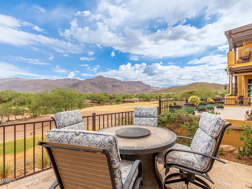Situated on a golf course lot with view of Dinosaur Mountain and the beauty of Gold Canyon. This 2 bedroom 2 bath home won't disappoint. A courtyard entrance leads you to a circular foyer, you will find LVP flooring and wood plantation shutters throughout, a fireplace, mountain and golf course views, a split floor plan with a walk in shower and tub in the master. The kitchen has all white cabinets, gray quartz counter tops, tile backsplash and stainless steel appliances and the fridge conveys. The inside laundry includes both washer and dryer and has a sink. The garage floor is coated. soft water system. The outdoor features the patio area with the amazing view of the golf course and mountains. Pride of ownership and upgrades galore in this fully furnished home.