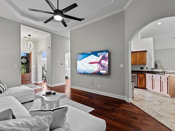 Beautiful 4 bed, 3 bath home on nearly half an acre with private wooded view and an inviting open layout. This split floor plan features soaring 12’ ceilings, plantation shutters, and abundant natural light throughout. The spacious primary suite offers a relaxing retreat with a walk-in closet, separate vanities, a large soaking tub, and a luxurious walkthrough double shower. The upstairs bedroom includes its own private full bath ideal for guests or a secondary suite. Downstairs enjoy multiple living spaces including a living room, formal dining, kitchen with breakfast area, and cozy hearth room. Step outside to a large fenced and covered patio with a wood-burning fireplace; perfect for year-round entertaining and decompressing. Recent upgrades include a 2022 HVAC system. Conveniently located near shops, dining, entertainment, and easy interstate access, this home combines comfort, privacy, and modern living in a peaceful setting.