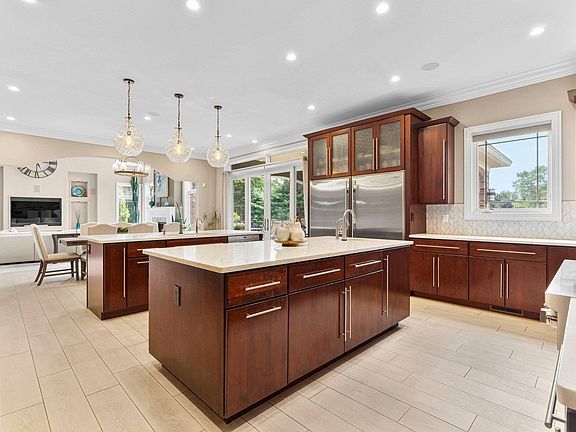 This exceptional all brick and stone estate blends timeless craftsmanship with modern luxury, offering an expansive layout and premier amenities both inside and out. Stunning entry with curved cherry staircase & 20' entry ceiling! Attention to detail with fine amenities like elegant stacked crown molding, 10’ ceilings, 8’ solid interior doors, cherry wood barrel ceiling, and a show stopping 20’ coffered ceiling in the great room with gas fireplace offer this home it's own fingerprint! The gourmet kitchen boasts of two islands with sinks, quartz countertops, custom cherry cabinetry, a full suite of Wolf and SubZero appliances, and a spacious butler’s pantry. A wet bar off the formal dining space, 2 guest powder rooms, drop zones off both garages, and a main floor bedroom suite with walk-in dressing room and luxurious ensuite complete the main level. An elevator shaft (currently additional closet space) adds future flexibility. The upper level impresses with tons of natural light. The owner’s suite, complete with a tray ceiling, gas fireplace, quartz double vanity, corner tub, tiled walk-in shower, and dream custom dressing room. Additional upstairs spaces include a private den with skylights, an open office with built-ins, a loft with beverage center, two additional bedrooms connected by a Jack & Jill bath with granite double vanity & oversized closets. The walk-out lower level is an entertainer’s dream with a full theater room (complete with seating, equipment, and sound), a game room, and a stylish bar area. A wine room with chiller, family room with gas fireplace, and patio doors add to the inviting ambiance. Wellness amenities include a steam shower, sauna, and workout/5th bedroom with full bath. Additional features include a lower level laundry, a NEW 50 KW industrial Generac generator & NEW HVAC Systems. This home offers unmatched comfort, functionality, and refinement. Enjoy your own private oasis with a salt water pool, hot tub, outdoor kitchen, and elegant tile decking. A picturesque pond with fountain is thoughtfully engineered. The 5-car attached heated attached garage features epoxy floors, drains, gas heaters, hot/cold water while a 1.5-car lower garage offers convenient outdoor storage.