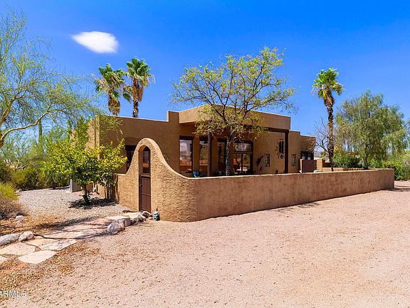 Stunning Superstition Mountain views are yours from the extended covered patio of this special Santa Fe home. This three bedroom, two bath home on 1.25 acres has it all!! Open split floor plan, large windows, tile throughout, new roof, sparkling pool, relaxing sunroom, RV canopy AND NO HOA! Kitchen features large island and newer appliances. The custom chicken yard 🐔🐔is perfect for multiple coops or small animals. Grandfathered 8x15 shipping container is perfect extra storage...Enjoy amazing sunrises and sunsets, hike, horseback ride or just soak in the spectacular views and desert that surround this unique property.