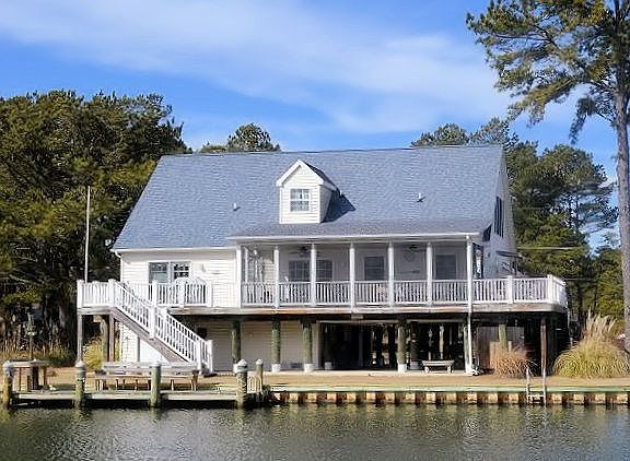 Lovely Waterfront home in Oyster Bay I on Chincoteague Island. 3 Bedrooms and bonus first level sunroom or 4th bedroom and 2.5 baths. Wrap around decking and covered porch add to the delight of this home. Well maintained and spacious this home has limited vacation rentals in season and always booked. Open great room concept and very large bedrooms. Dock, pier, underneath storage area. This home conveys furnished and ready to enjoy.