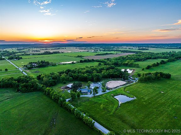Welcome to Mud Creek Ranch, a true working ranch and cowboy’s dream. NEWLY PAVED ROAD and MORE land available. This incredible 5-bedroom, 3.5-bathroom ranch-style home sits proudly in front of 35/- acres of native grasses, including Bermuda and Bluestem, mature shade trees, and a flowing creek more. Behind the secure gated entry, you'll find a thoughtfully designed two-story home with hardwood laminate floors, a gas range, and ample storage throughout. The primary suite boasts a double vanity and double shower. The home is equipped with a whole-home generator, and a 6-person IN HOUSE storm cellar for added peace of mind. The 6-stall horse barn features a 30x60 foot individual turnouts for each stall, and plenty of space for hay and feed storage. The one of a kind revolving tack room door makes in-and-out access simple and efficient. The 60' 5-horse Equisizer with a worked bottom keeps your horses active—even in rainy weather. Fully lit 1.09-acre arena built right and outfitted with 32,000-lumen lights on galvanized steel poles, boxes, chutes, sorting pens, and runs. The ranch includes a 76' x 40' red iron shop and a 30-foot lean-to, providing ample space for heavy equipment, repairs, and storage. A fuel tank is on site for convenience, keeping your equipment and vehicles ready to go. Enjoy two fully stocked ponds covering just over an acre—ideal for livestock, recreation, and catching hybrid bass on nearly every cast. Hitching posts are strategically placed for brushing, washing, and saddling, as well as a layout made to pull a trailer easily throughout the ranch making this property functional and ready for daily use. Located just 2 miles north and 2.5 miles west of Pryor, and less than 5 miles from Claremore, this rare combination of rural charm and modern amenities is hard to find.