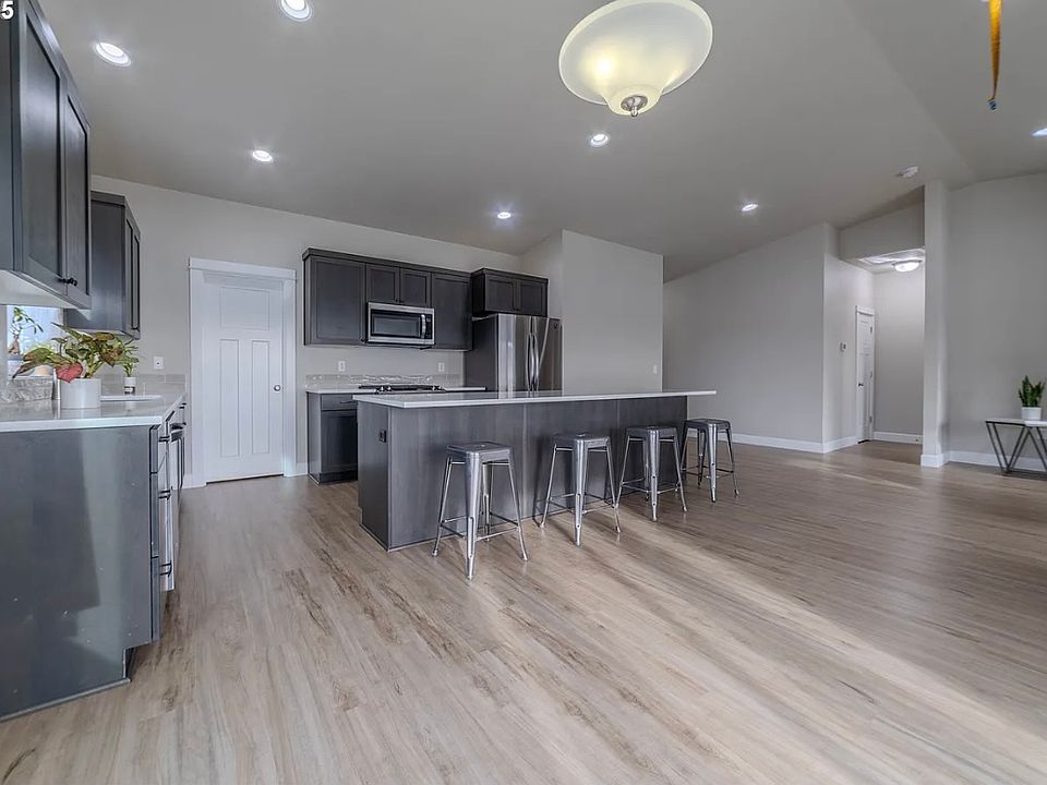Home, ready for you to move into! With an open and inviting floorplan. 3 bedrooms, 2 bathrooms and a 3 car-garage. Standard features include stainless steel appliances including a gas range, quartz counters, large kitchen island/breakfast bar, durable laminate flooring, primary bedroom with ensuite bath with dual sinks and glass shower doors. Front landscaping with sprinklers and includes lawn service weekly.