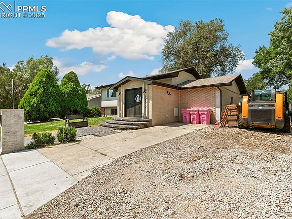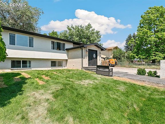This charming 4-bedroom, 2-bath bi-level home sits on a spacious lot in a peaceful, family-friendly neighborhood. You'll love the convenience of being just minutes from Fort Carson, Peterson AFB, Amazon Distribution Centers, and a growing variety of new restaurants and shopping options. Located within walking distance to a newly renovated elementary school, a middle school, and Mesa Ridge High School, this home is perfect for families. Fully remodeled in 2019 and thoughtfully updated since, the home features a stunning custom-built 14x14 entryway/mudroom that adds both space and function. Upstairs, enjoy beautiful hardwood floors, a bright living room, and a modern kitchen with white cabinets and updated appliances. The dining area opens onto a spacious deck with mountain views—ideal for morning coffee or evening gatherings—and overlooks a huge backyard with plenty of room to play or relax. The upper level also includes the primary bedroom, an additional bedroom, and a full bathroom. Downstairs, you’ll find three more bedrooms with great natural light, a second full bathroom, and a large laundry area. One of the home's standout features is the converted garage space. Originally designed as a theater room, it was later transformed into a classroom during the pandemic—offering flexible space for a home office, gym, playroom, or the option to convert it back into a single-car garage.